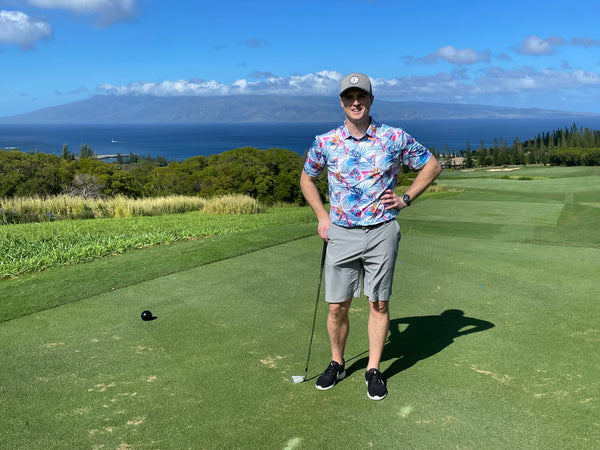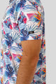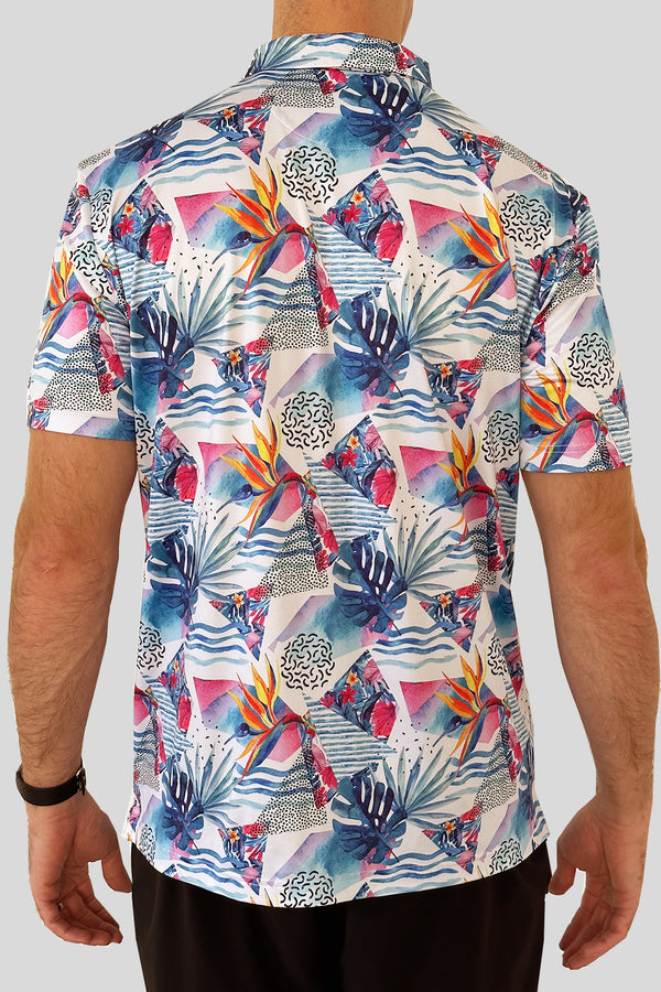 The Michael is an athletic fitting polo which features a bright white base with geometric design including colorful birds of paradise and monstera leaves.