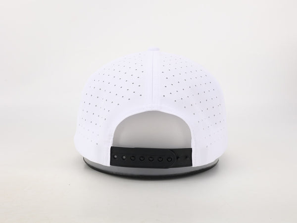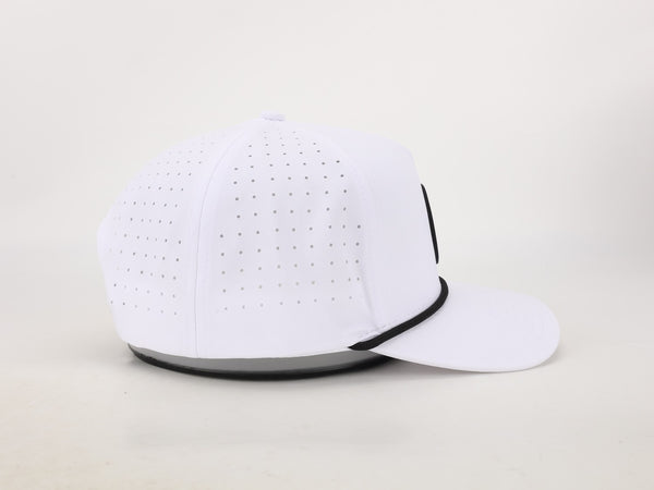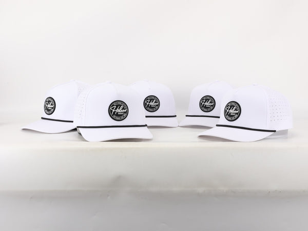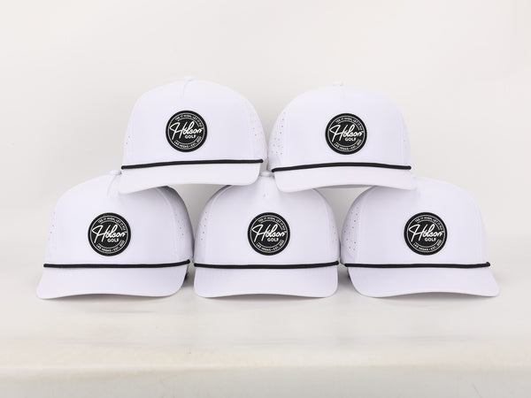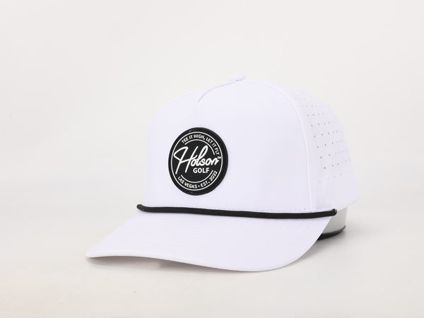 This white snapback hat with a black rope trim features our signature logo and the tagline "Tee It High, Let It Fly." Made from durable polyester and nylon, it’s perfect for keeping your head and face shaded during your round!