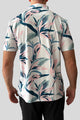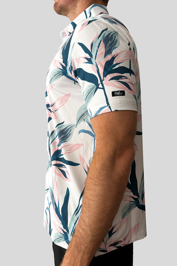 The Paul polo, features a bright white base with blue and pink birds of paradise flowers. This shirt is a classic, similar to its name sake.