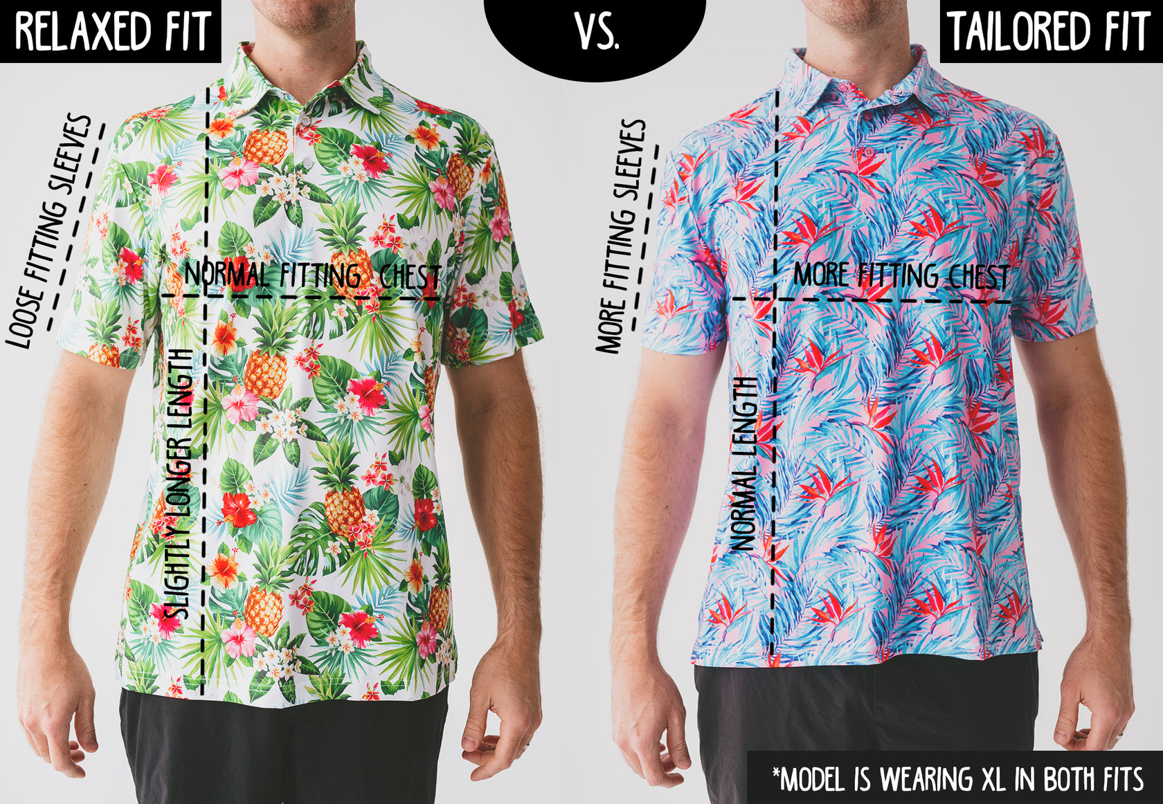 Holson Golf offers 2 Golf Polo Fits: Relaxed Fit and Tailored/Atheltic Fit see comparison chart below.